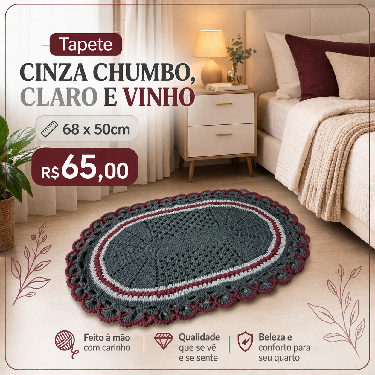 Tapete cinza chumbo claro e vinho 68x50cm