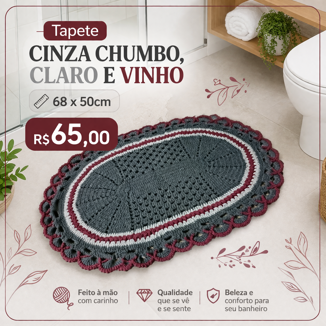 Tapete cinza chumbo claro e vinho 68x50cm